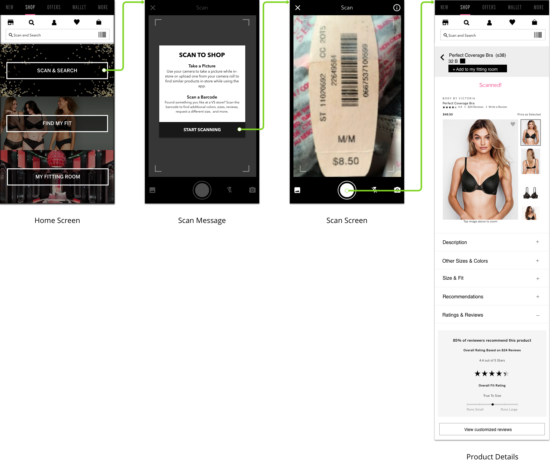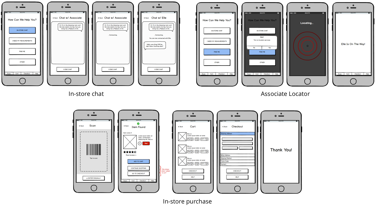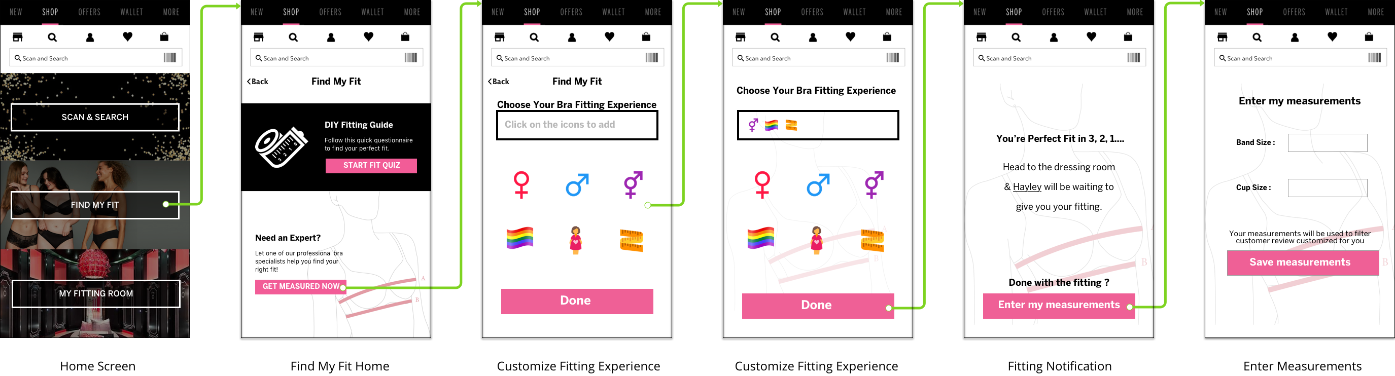 This flow gives users the option to control their own bra-fitting experience by allowing them to choose whether they want to size themselves for a fitting or get help from the Sales Associate.