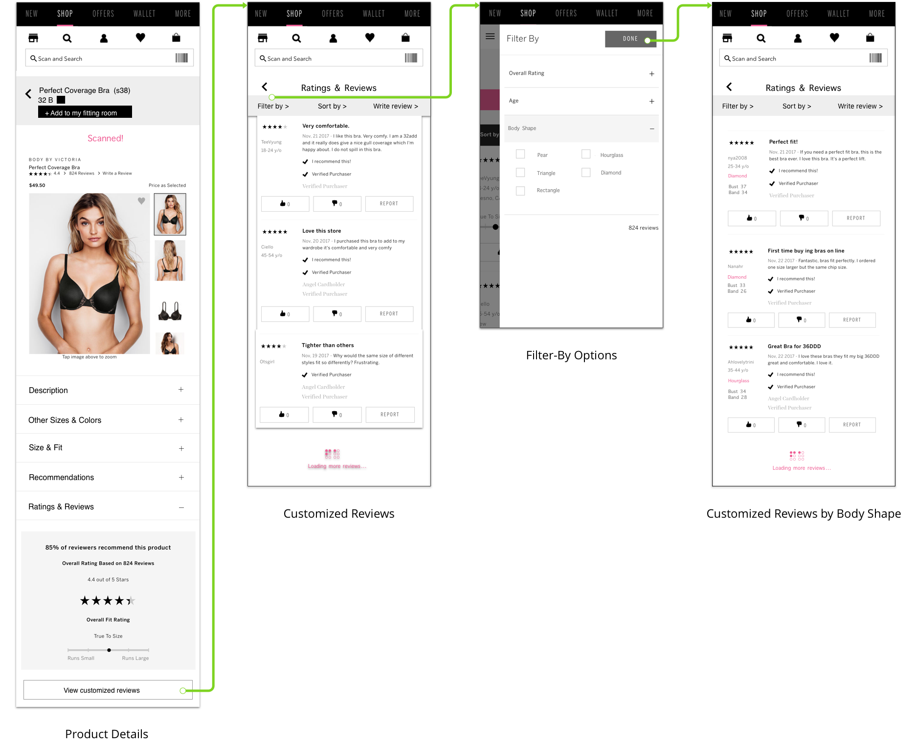 This flow describes how the user can see customized reviews based on their measurements if entered, or by filtering products through different categories.
